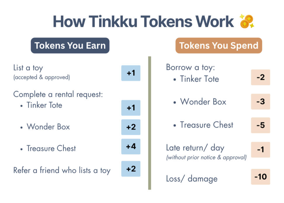 Use tokens to borrow toys instead of cash. Earn tokens when you share toys or refer friends — then spend them to borrow from the collection.