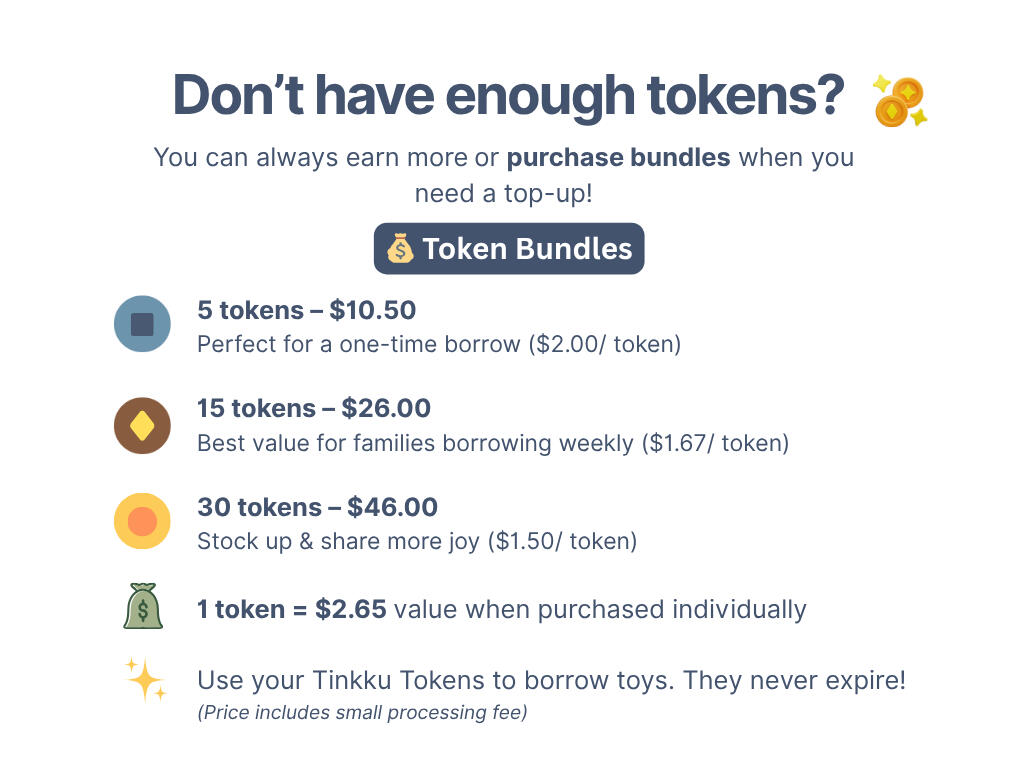 • 30 tokens for $46*includes small processing feeCan I lend toys too?